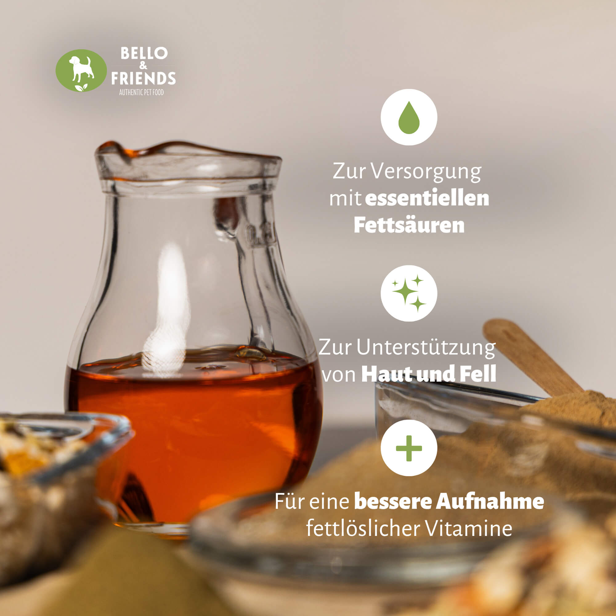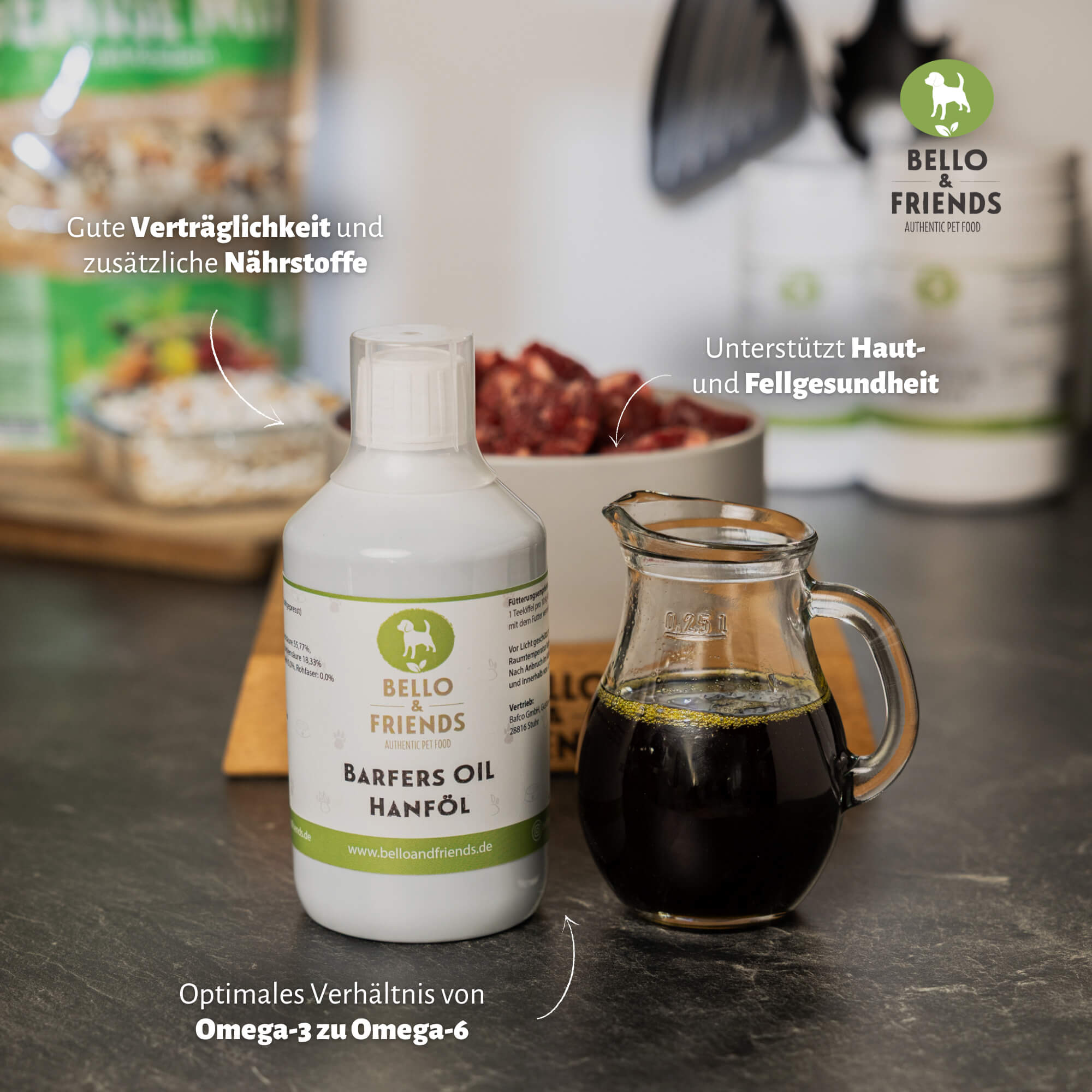Kaltgepresstes Hanföl ist eine hochwertige pflanzliche Ergänzung für die tägliche Fütterung von Hunden und eignet sich ideal zur Unterstützung einer ausgewogenen Fettsäureversorgung. Es liefert von Natur aus wertvolle Omega-3- und Omega-6-Fettsäuren in einem ausgewogenen Verhältnis und kann BARF-, Nass- oder Trockenfutter sinnvoll ergänzen.
