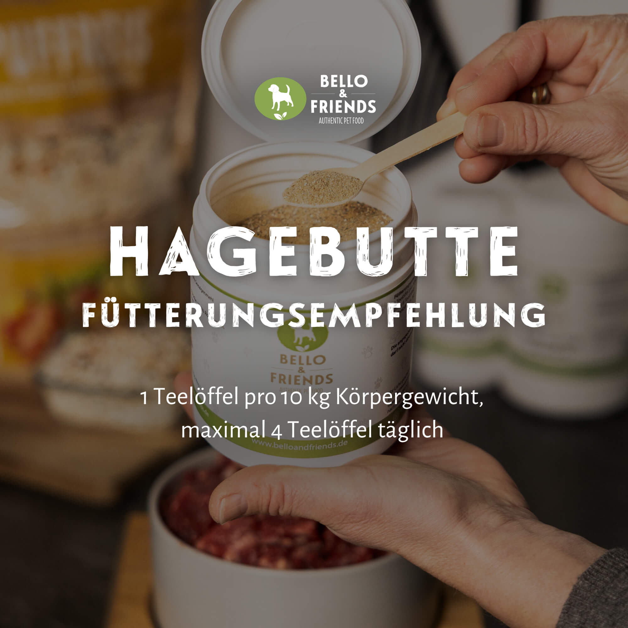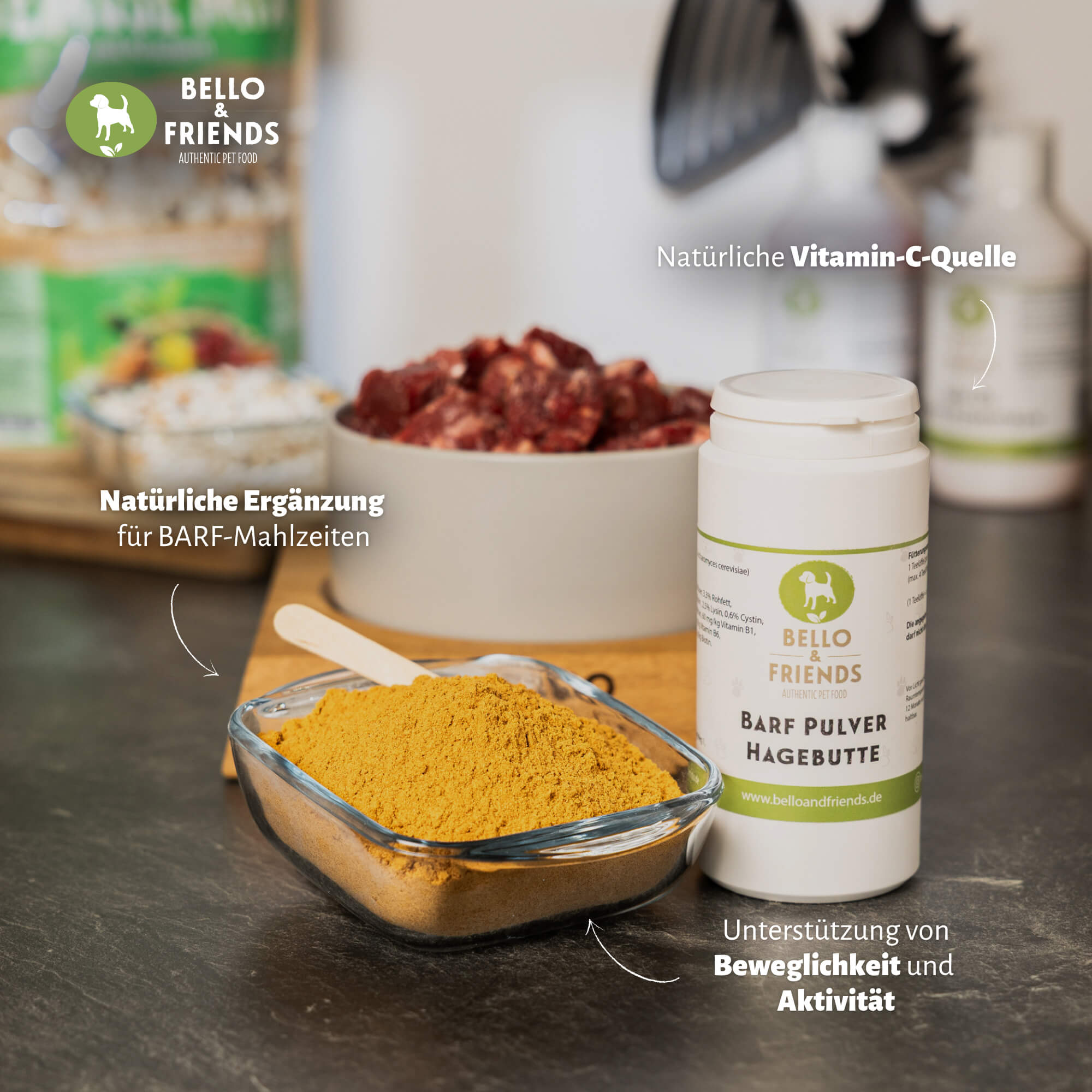Gerade bei aktiven, sportlich geführten oder älteren Hunden wird Hagebuttenpulver gerne ergänzend gefüttert. Es lässt sich einfach unter das tägliche Futter mischen und ist sowohl für BARF-Rationen als auch für Nass- oder Trockenfutter geeignet.