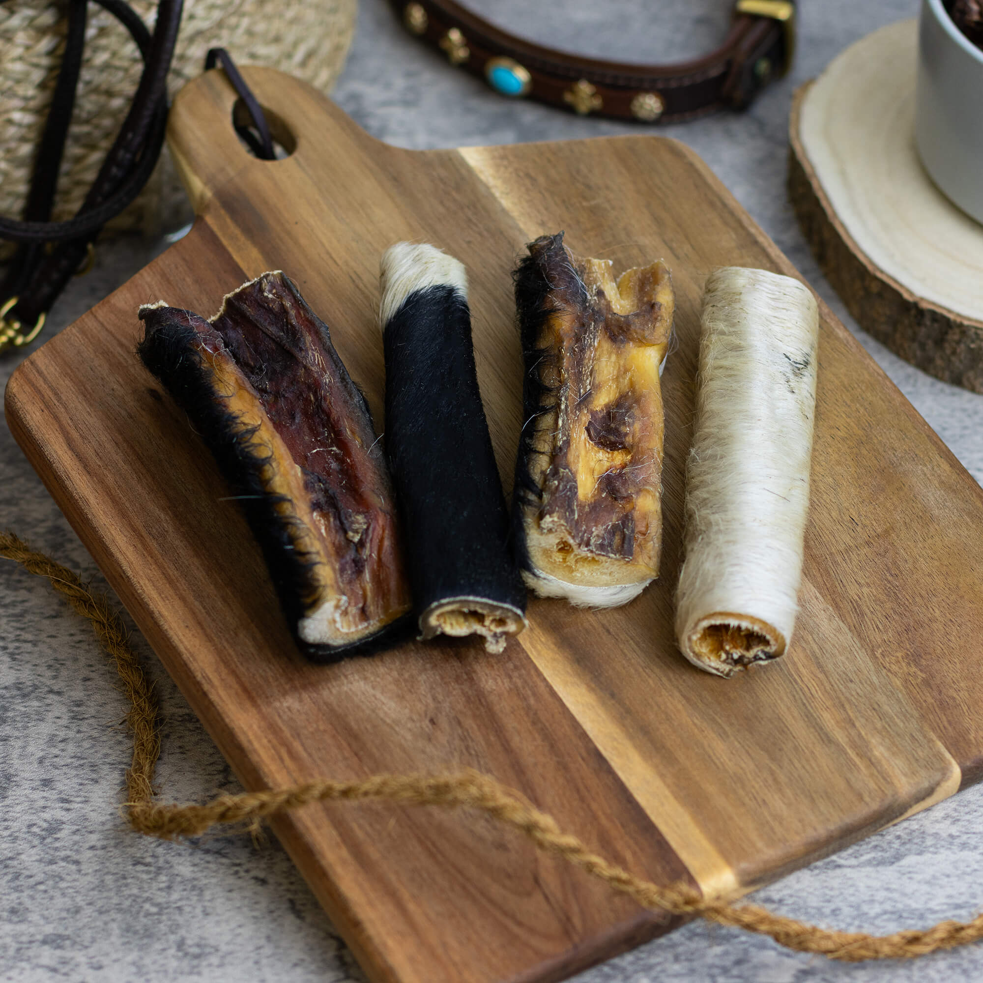 Die getrocknete Rinderhaut mit Fell kommen als leckere & artgerechte Streifen zu Dir und Deinem Hund.