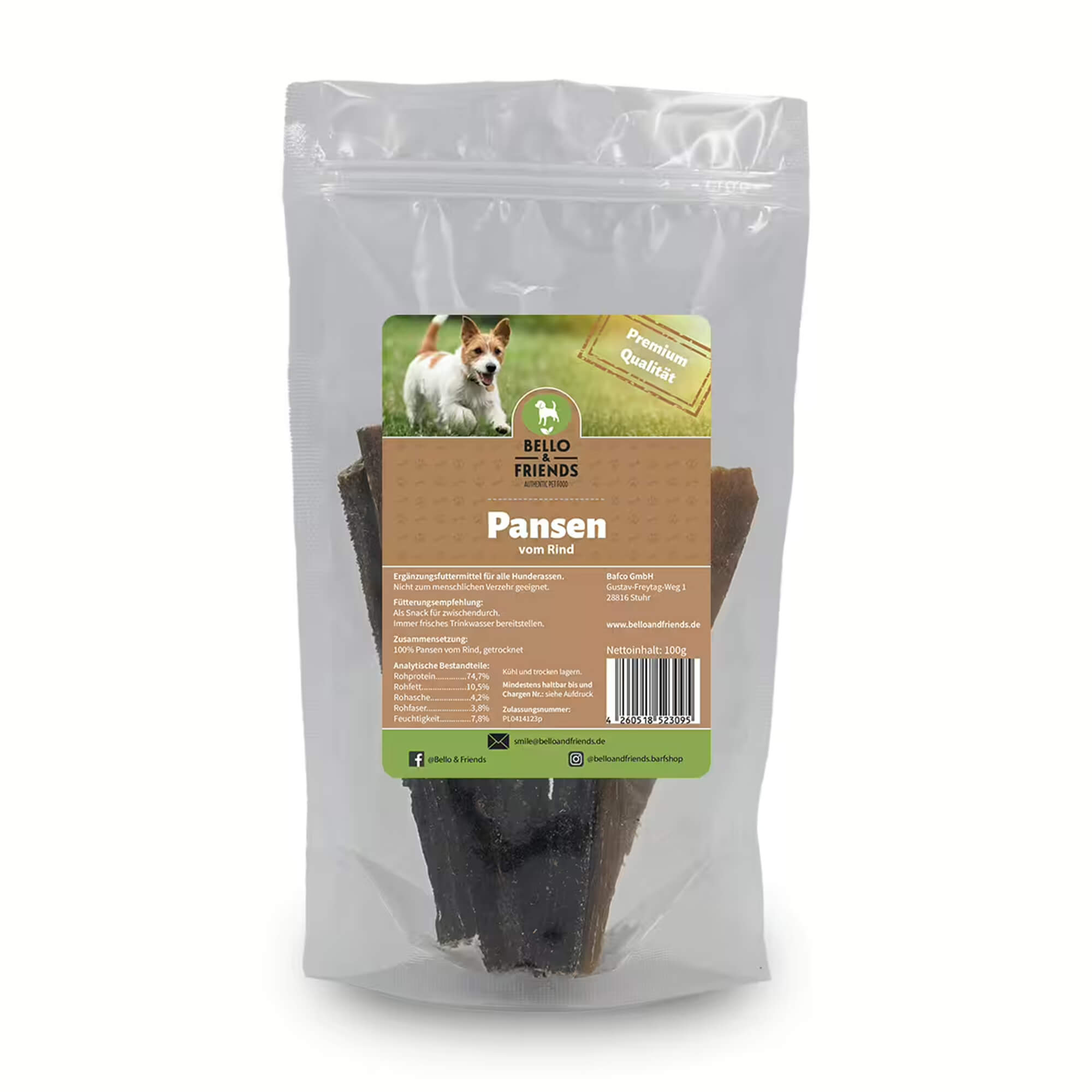Getrockneter Pansen vom Rind ist für Hunde ein besonders schmackhaftes Leckerchen und wird allseits gerne gefressen. Pansen gehört zu dem natürlichen Fressschema von Hunden und steht neben Innereien und Muskelfleisch schon seit jeher auf seinem Speiseplan.