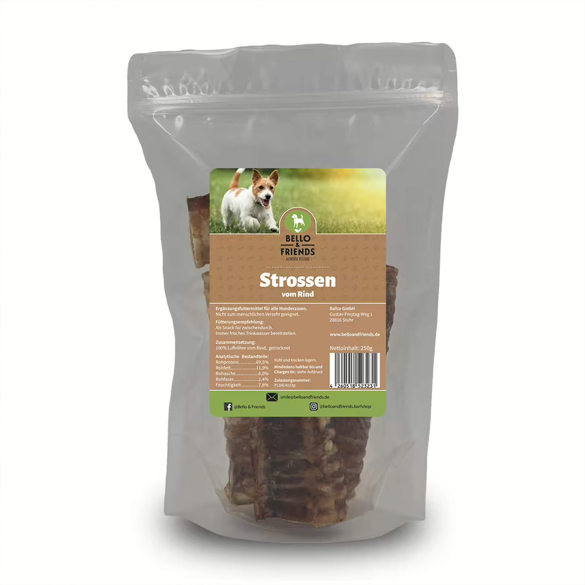 Unsere Rinderstross-Stücke werden in unserer eigenen Manufaktur unter höchsten Qualitätsstandards hergestellt und schonend getrocknet. Wir verwenden nur natürliche Zutaten und verzichten vollständig auf künstliche Zusätze, Lockstoffe und Konservierungsmittel. Das Produkt ist selbstverständlich frei von Zucker und unnötigen Füllstoffen, sodass du deinem Hund einen gesunden und natürlichen Snack bieten kannst.
