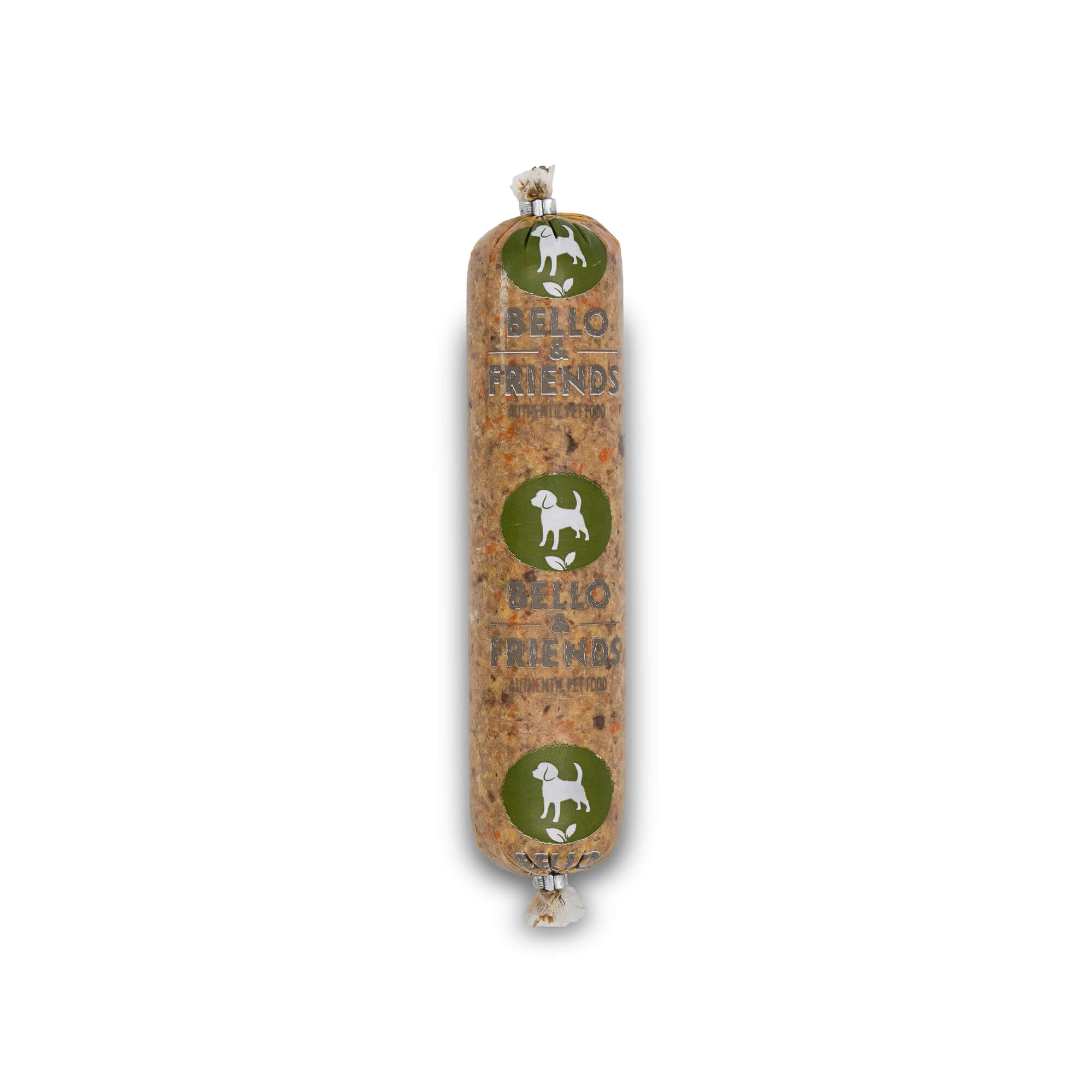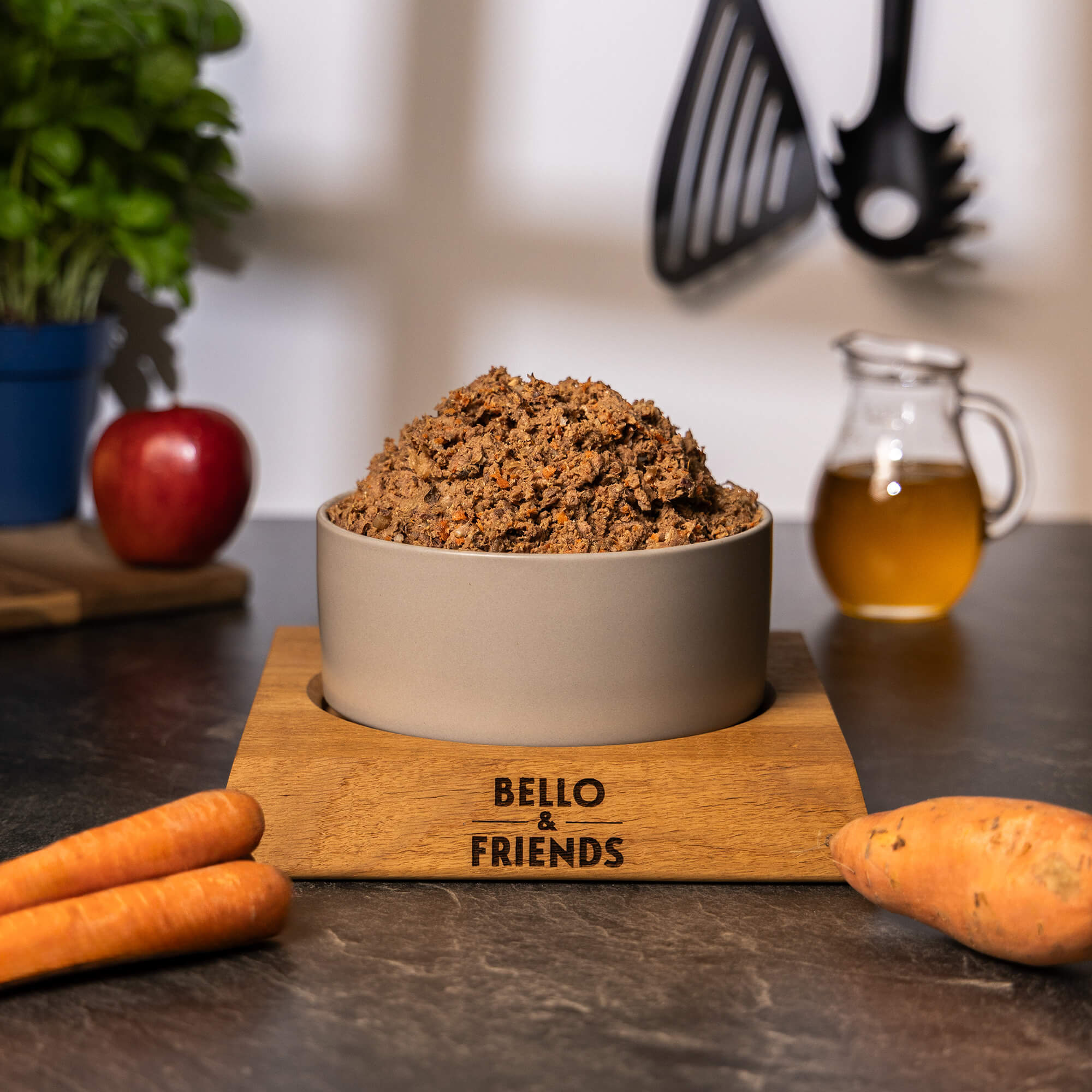 Wie bei all unseren Schlemmer Menüs dürfen auch hier die bewährten Zutaten für eine vollwertige Mahlzeit nicht fehlen: Bello’s Vitalmix, Eierschalenpulver für die Calciumversorgung, Leinöl für Haut und Fell sowie eine Prise Meersalz und Seealge für die natürliche Mineralstoffbalance.