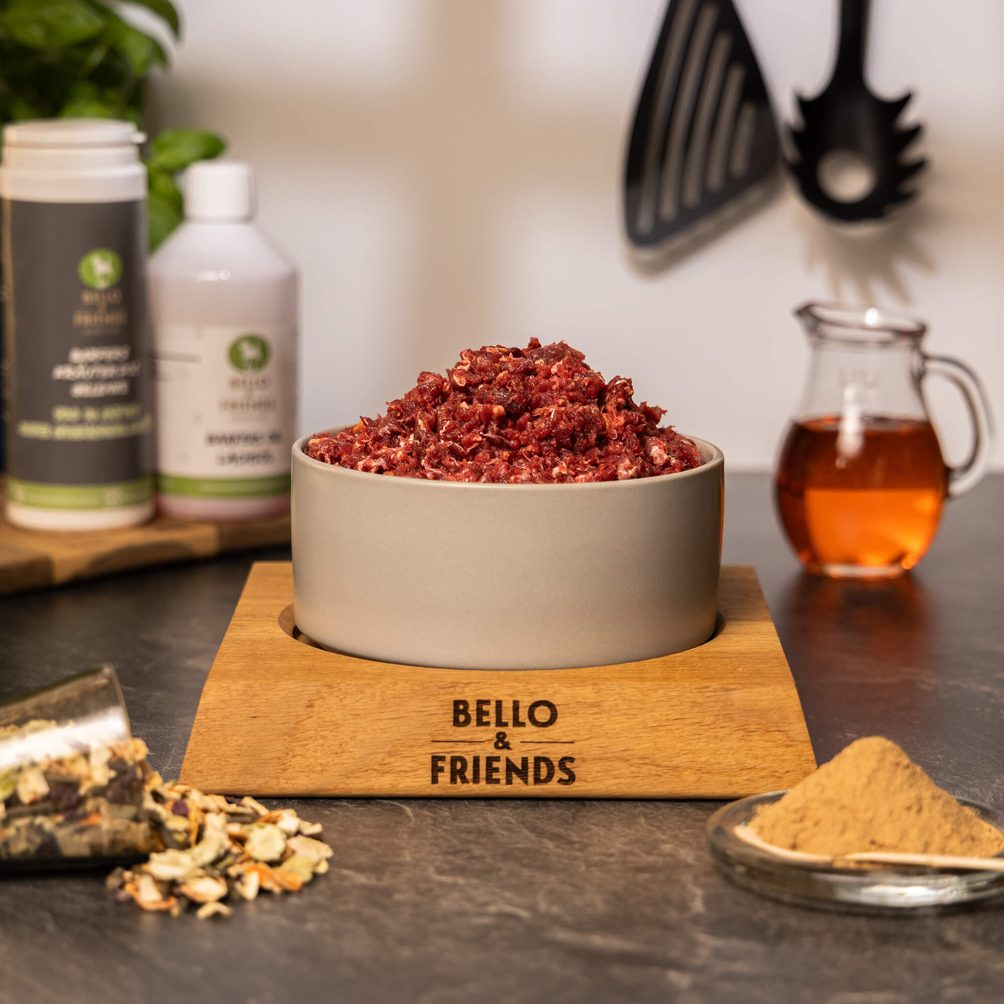 Bitte beachte, dass dieses Produkt allein keine vollwertige und ausgewogenen Mahlzeit für Deinen Hund darstellt, sondern nur ein Einzelfuttermittel ist. Im Rahmen eines BARF-Plan müssen noch pflanzlichen Anteile, Öle und Zusätze beigefügt werden. Falls Du dazu Fragen hast, sprich uns an, oder vertrau auf die Qualität unserer BARF Complete Menus, wo wir für Dich die optimale Komposition bereits zusammengestellt haben.