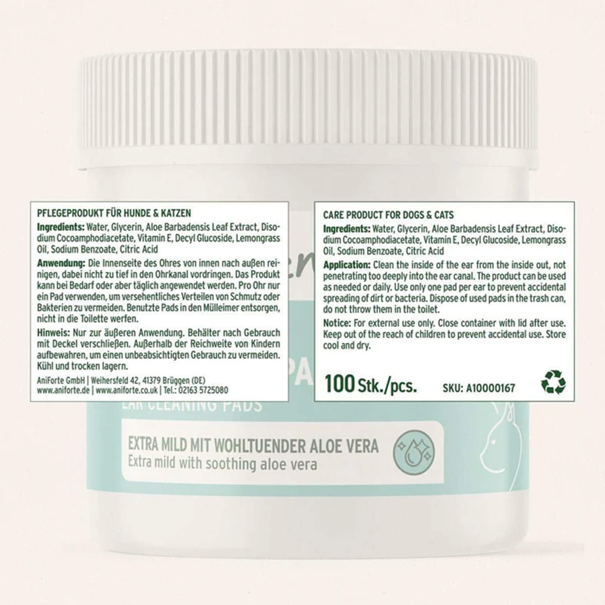 Die Pads enthalten wohltuende Aloe Vera, die für ihre beruhigenden und pflegenden Eigenschaften bekannt ist. Aloe Vera hilft dabei, die empfindliche Haut im Ohrbereich zu beruhigen und zu regenerieren. Die AniForte® Ohren-Reinigungspads sind besonders sanft und somit auch für Welpen und Katzen geeignet, was sie zu einem unverzichtbaren Bestandteil der täglichen Pflege macht.