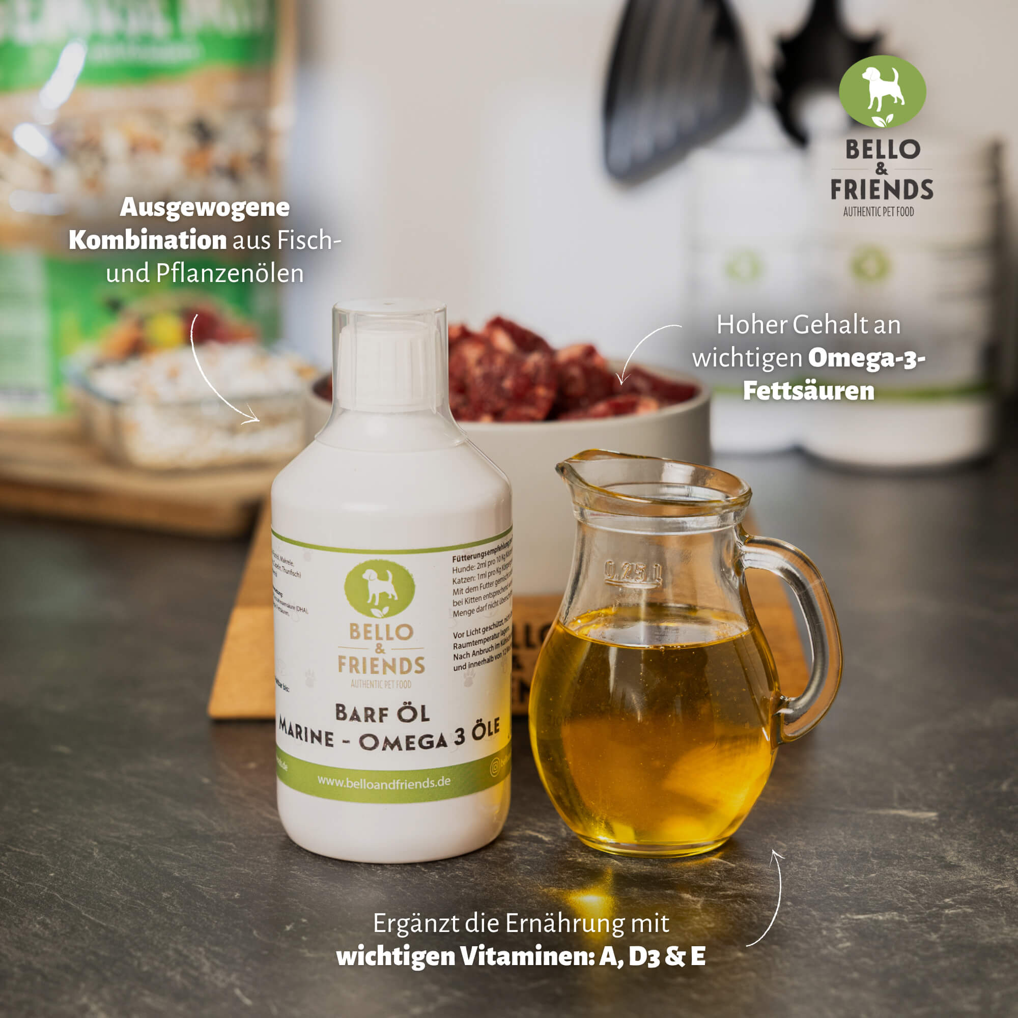 Hochwertige Marine Omega-3-Öle liefern essenzielle Fettsäuren und sind eine wertvolle Ergänzung für die tägliche Fütterung von Hunden und Katzen. Die ausgewogene Kombination aus Fischölen und pflanzlichen Ölen unterstützt eine bedarfsgerechte Versorgung mit Omega-3- und Omega-6-Fettsäuren und eignet sich ideal für BARF- sowie Nass- oder Trockenfutterrationen.