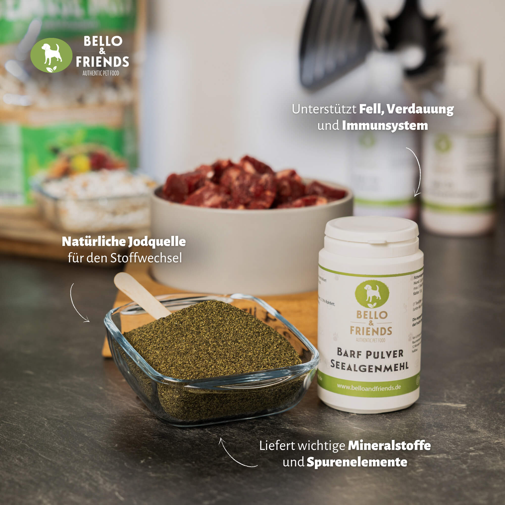 Das feine Pulver lässt sich einfach unter das tägliche Futter mischen und eignet sich sowohl für BARF- als auch für Nass- oder Trockenfutter. Aufgrund des natürlichen Jodgehalts sollte die Dosierung sorgfältig eingehalten werden.