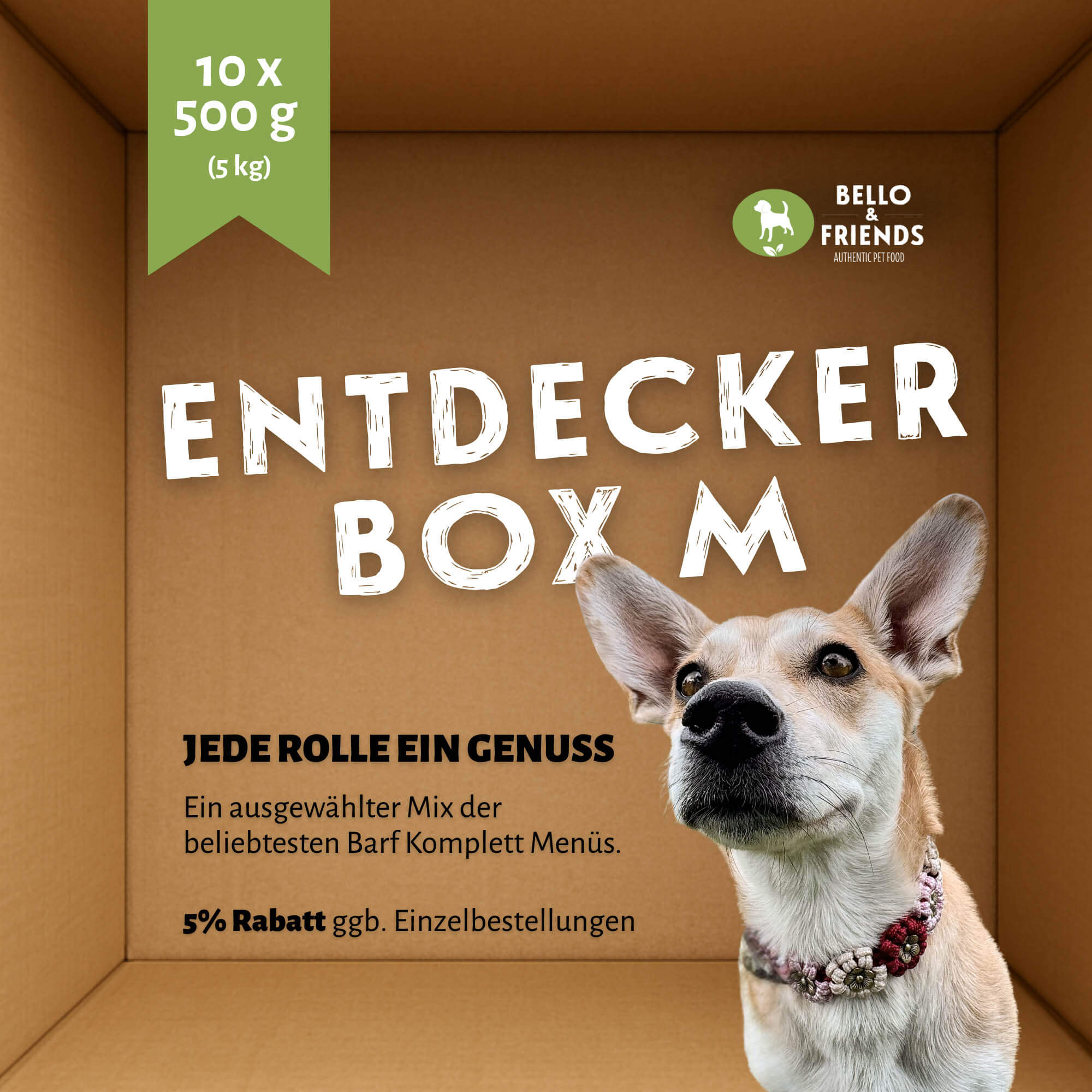 ENTDECKER BOX M Ideal für mittelgroße bis große Hunde – von Cocker Spaniel bis Schäferhund. 5 Kilo BARF COMPLETE MENU’s in der Vorteilsbox (10 x 500g Portionen). Unsere beliebten Komplettmenüs jetzt ganz einfach als Box bestellen. Ein reichhaltiger & abwechslungsreicher Ernährungsplan bringt Leben in den Napf Deines Vierbeiners. Überrasche Deinen Hund jeden Tag neu und fördere aktiv sein Wohlbefinden mit unseren leckeren Frischfleisch-Mahlzeiten. Frisches rohes Fleisch, saftiges Obst und knackiges Gemüse vom Wochenmarkt bilden bei unserem BARF Complete die authentische Grundlage. Zusätzlich reichern wir jedes Complete Menu mit herrlich duftenden Kräutern der Provence an und fügen echtes Meersalz hinzu. Ein Schuss kaltgepresstes Öl zum Schluss macht alles perfekt.