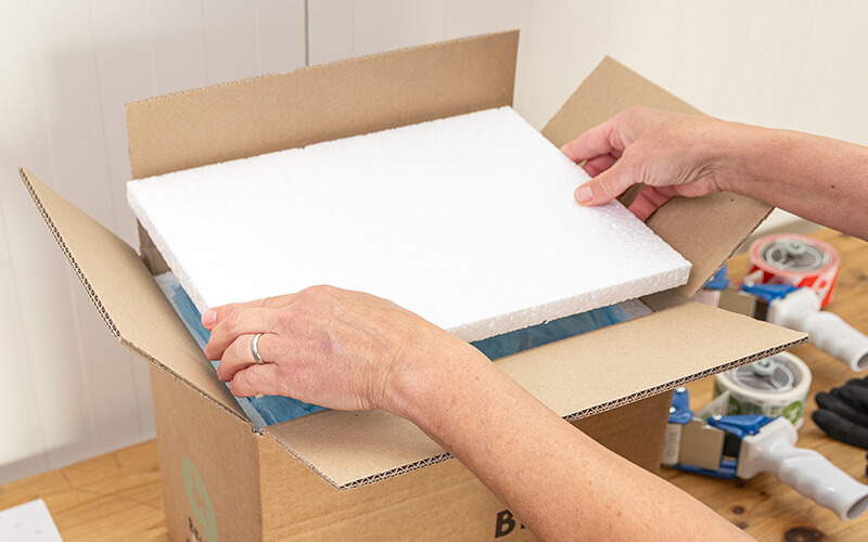 Auch der Deckel wird isoliert, dann verschließen wir den Karton und übergeben eure Bestellung kurz darauf unserem jeweiligen Versandpartner.