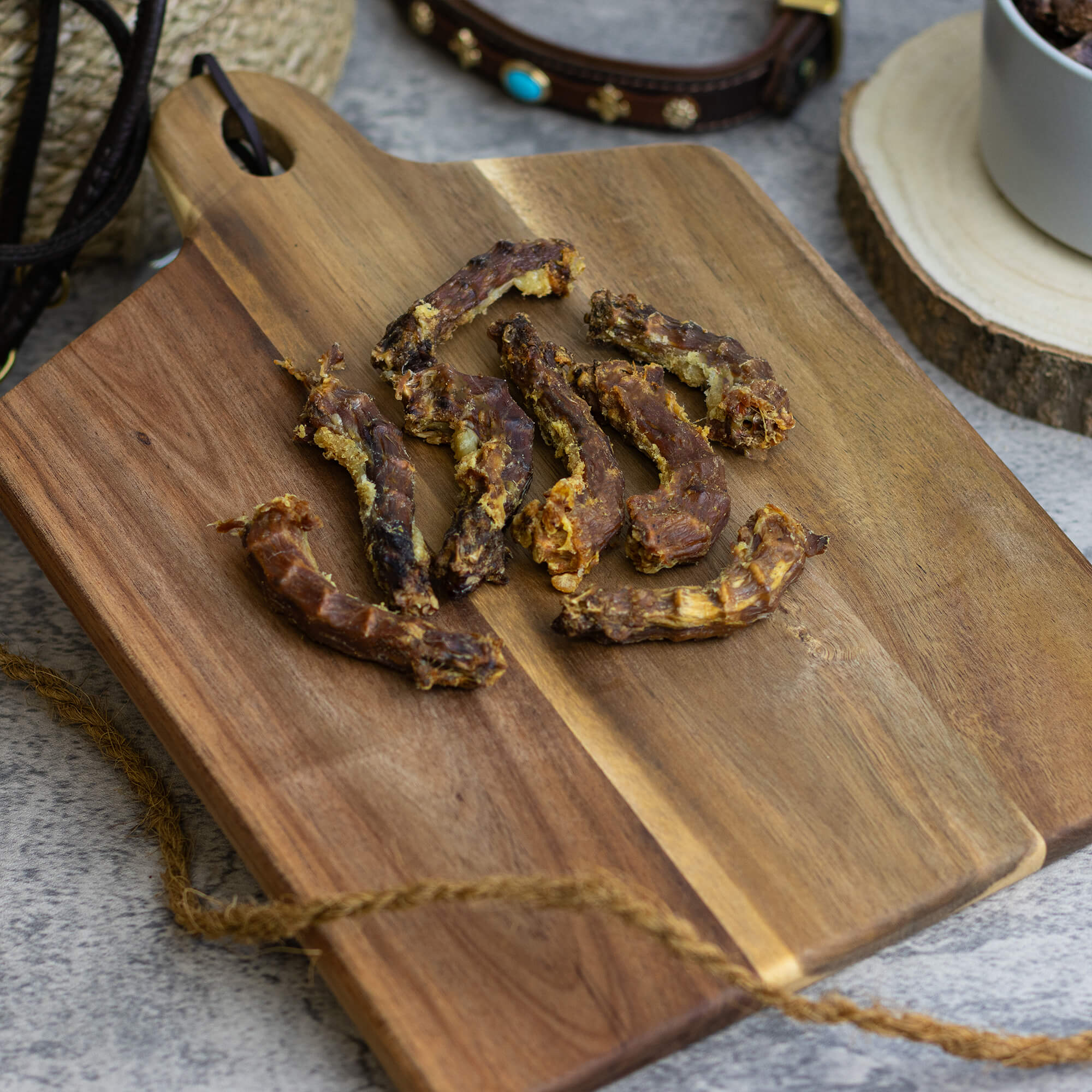 Getrocknete Hähnchenhälse für Hunde sind nicht nur ein besonders knackiger Gaumenschmaus mit leckerem Geschmack. Der Geruch erinnert entfernt an deftiges Brathähnchen.