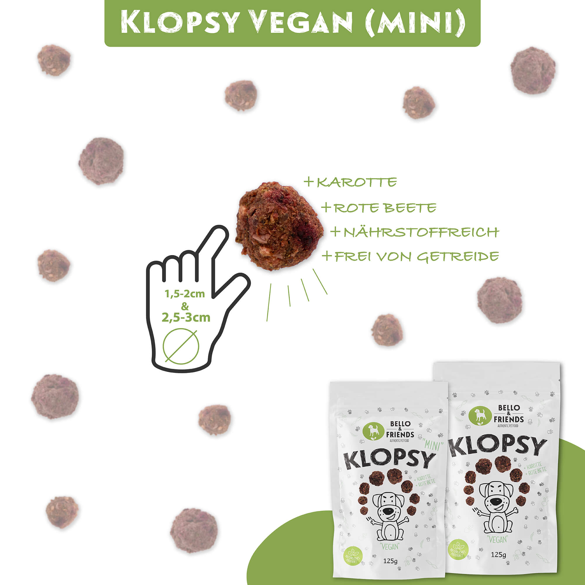 Unsere Klopsy Vegan sind in zwei praktischen Größen erhältlich: Normal und Mini. Die normalen Klopsy sind ideal für mittelgroße bis große Hunde, während die Mini-Klopsy perfekt für kleine Hunde oder als Trainingsleckerli geeignet sind. So findet jeder Hund die passende Größe und kann den vollen Genuss der veganen Fleischbällchen erleben.
