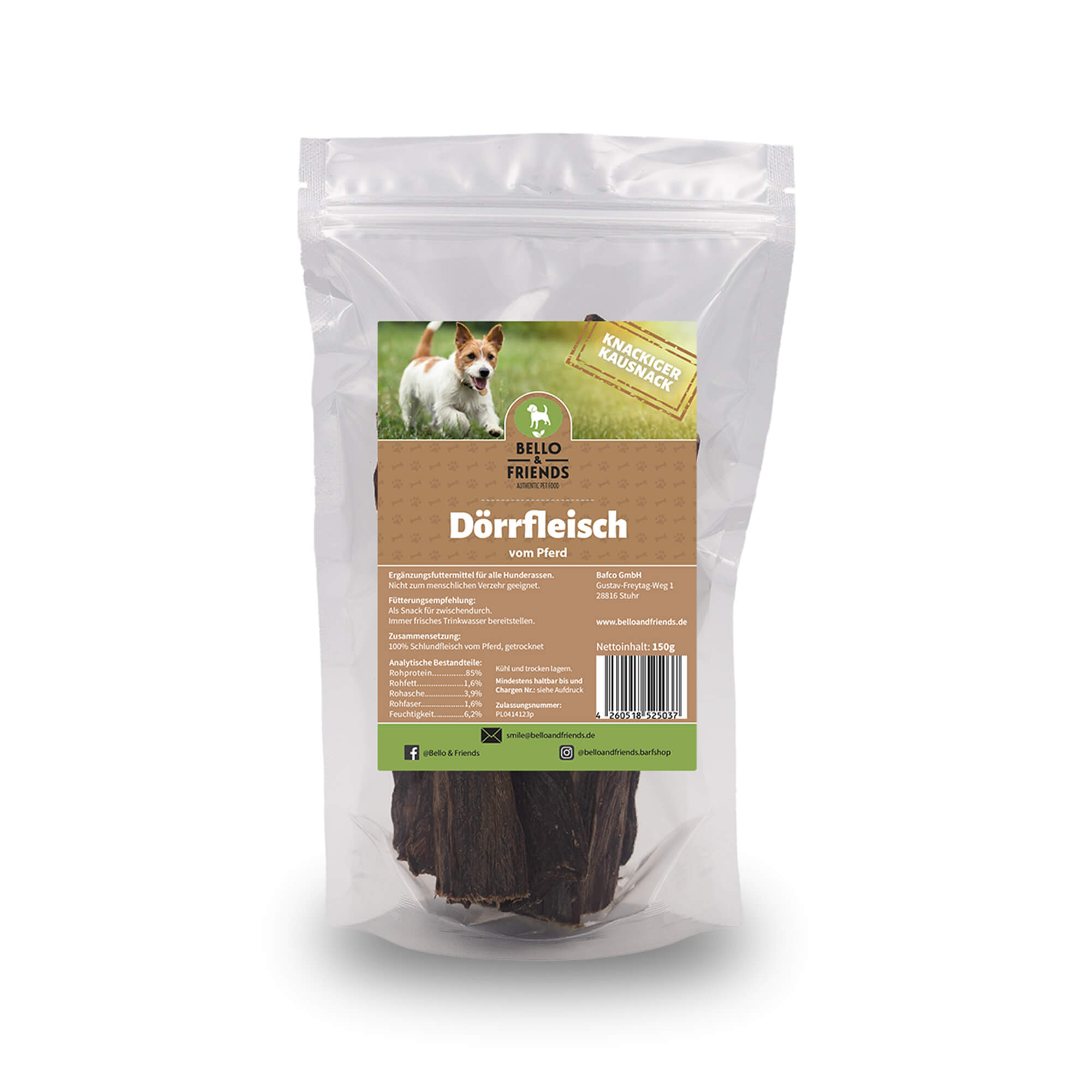 Unser schonend getrocknetes Pferdedörrfleisch aus eigener Manufaktur ist ein besonderer Hochgenuss für Deinen Hund. Das besonders allergikerfreundliche Pferdefleisch ist auch für sensible Mägen oft gut verträglich. Die zähe Struktur unseres Pferdedörrfleischs bringt Deinem Hund langen Kauspaß mit viel Genuss.