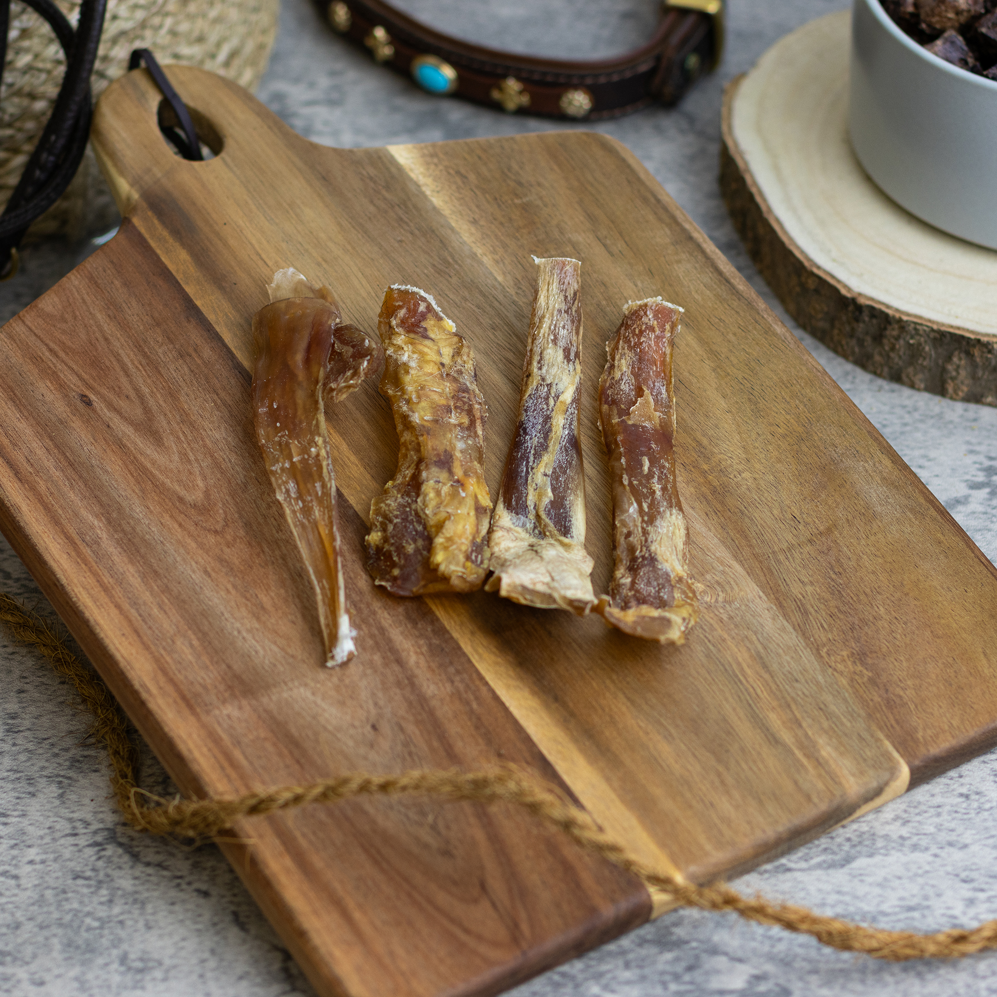 Durch die harte Struktur der getrockneten Sehne muss Dein Liebling sich richtig anstrengen, um etwas von seinem leckeren Snack ab zu bekommen. Erst wenn das Gewebe aufgeweicht ist, kann er Stückchen für Stückchen davon genießen.