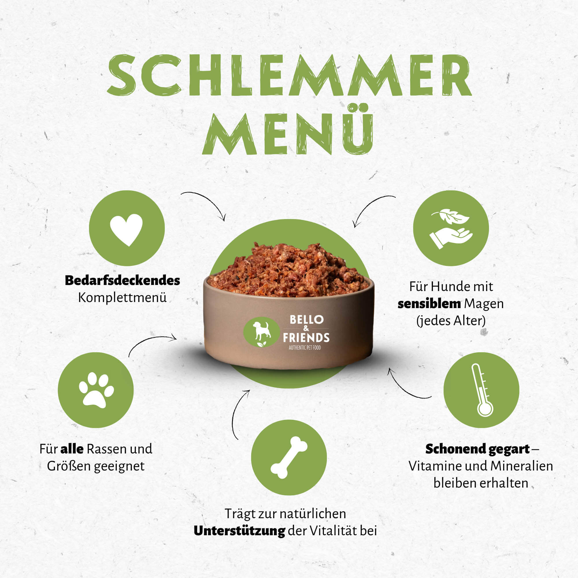 Gegart statt Roh - Mit unserem Schlemmer Menü bringen wir eine besonders bekömmliche und ausgewogene Mahlzeit in den Napf – perfekt für alle Vierbeiner, die es gerne leicht mögen, aber auf vollen Geschmack und beste Nährstoffe nicht verzichten wollen. Durch die schonende Garung bleibt das Menü nährstoffreich und gut verträglich, insbesondere für sensible Hundemägen oder ernährungsbewusste Vierbeiner.